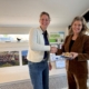 Op ‘e foto klysters Joanneke en Bertus mei direkteur en learkrêften fan it Pompeblêd.