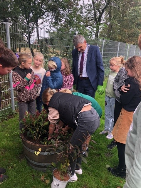 Om “stien wurdt grien” ek praktysk te meitsjen krigen de skoallen in plantenbak foar op it skoalplein. Op de foto: bestjoerders en bern plantsje tegearre de strûken.